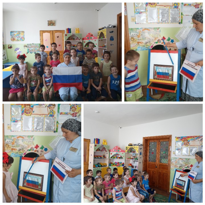 Сегодня в МБДОУ Детский сад√1 " Малх" с. Побединское прошли беседы во всех возрастных группах на тему "День Российского Флаг"