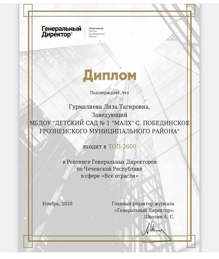 Участник Рейтинга Генеральных Директоров Лиза Гурмалиева занимает место №394 в отрасли «Образование» по Чеченской Республике по состоянию на 22 ноября 2020 года.