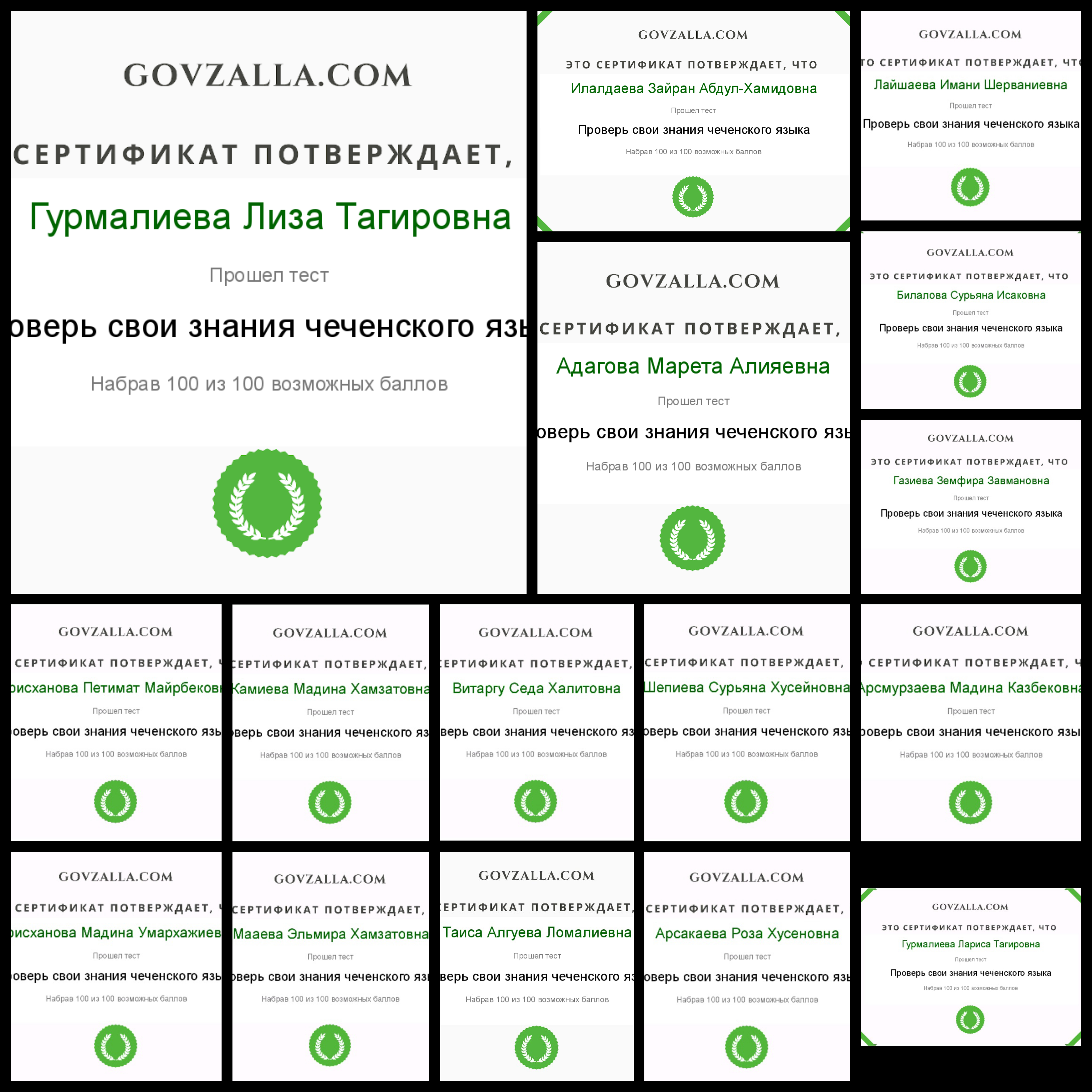 Сотрудники МБДОУ Детский сад 1 "Малх" с Побединское Грозненского муниципального района прошли тест "Проверь свои знания чеченского языка" на сайте GOVZALLA.COM о чем получили соответствующие сертификаты.