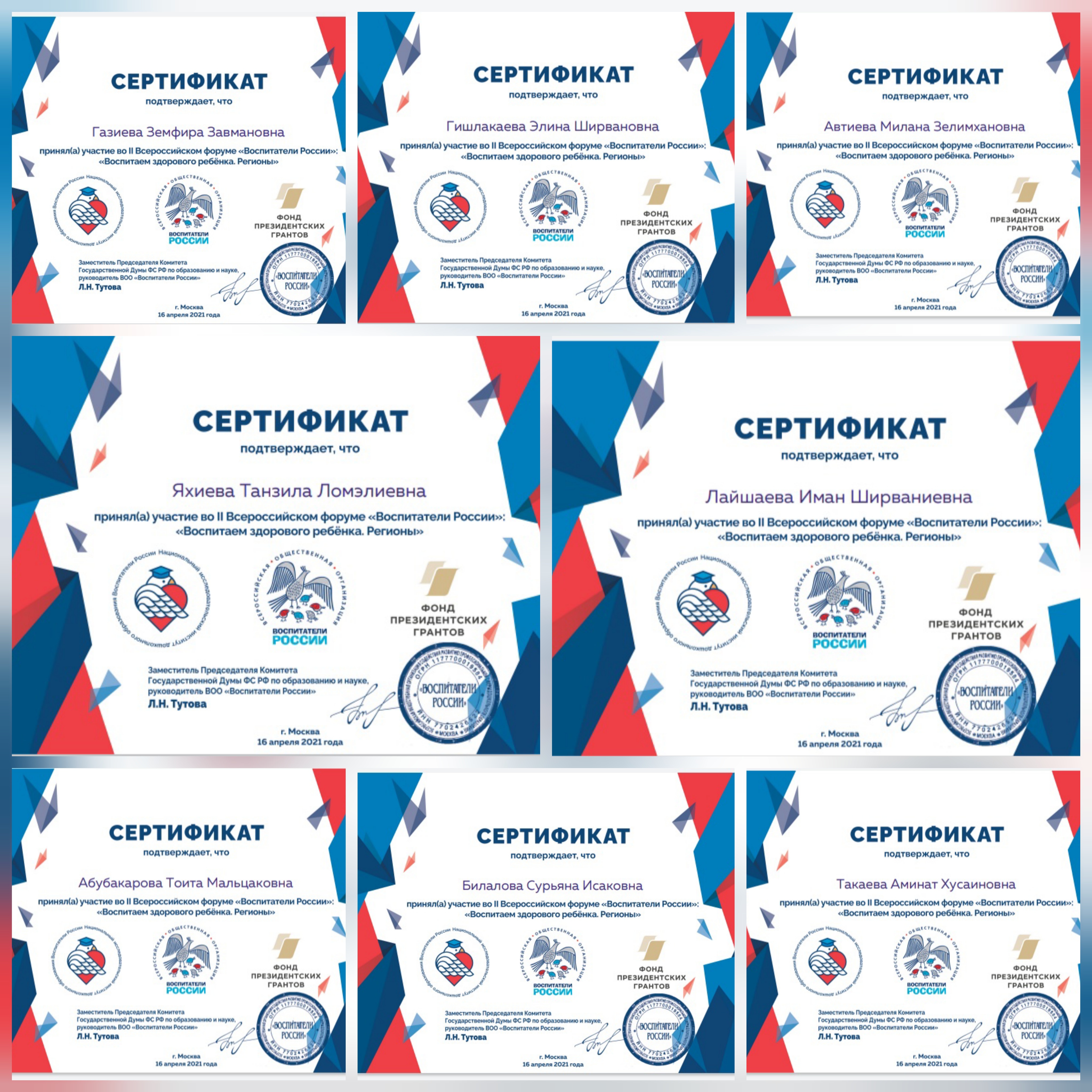 Воспитатели и педагогические работники МБДОУ "Детский сад 1 "Малх"" приняли участие во ӀӀ Всероссийском форуме "Воспитатели России": "Воспитаем здорового ребенка. Регионы" О чем получили соответствующие сертификаты