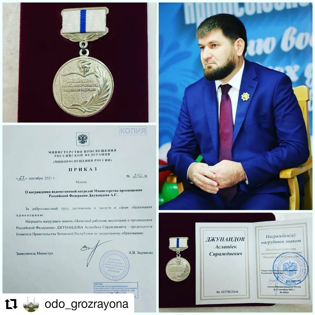 Сегодня поздравляем Джунаидова Асланбека,Председателя Комитета Правительства Чеченской Республики по дошкольному образованию, за добросовестный труд, достижения и заслуги в сфере образования награждён нагрудным знаком «Почетный работник воспитания и просвещения Российской Федерации». Эта награда стала благодарностью и результатом труда Асланбека Сираждиевича в сфере образования и воспитания подрастающего поколения почти за двадцать лет, последние десять из которых прошли в качестве руководителя системы дошкольного образования республики. Для всех нас, родившихся в семье педагогов и не понаслышке знающих цену учительского труда, эта награда имеет особую цену. Отрадно отметить, что Асланбек Сираждиевич в команде Первого Президента Чеченской Республики, Героя России Ахмат-Хаджи Кадырова (Дала г1азот къобал дойла цуьнан!) достойно продолжает трудовой путь наших родителей, известных педагогов Джунаидова Сиражди и Джунаидовой Хадижат, посвятивших всю свою сознательную жизнь сфере образования, вырастивших не одно поколение, труд которых отмечен государственными и ведомственными наградами. Продолжая трудовой путь родителей, все члены нашей семьи сегодня так или иначе связаны с воспитанием и образованием подрастающего поколения. Сегодня, благодаря усилиям и вниманию Главы Чеченской Республики, Героя России Рамзана Ахматовича Кадырова, система образования в нашей республике всесторонне развивается, растёт престиж педагогичеческого труда. Каждый из нас безгранично рад тому, что имеет возможность внести свою лепту в это богоугодное дело.