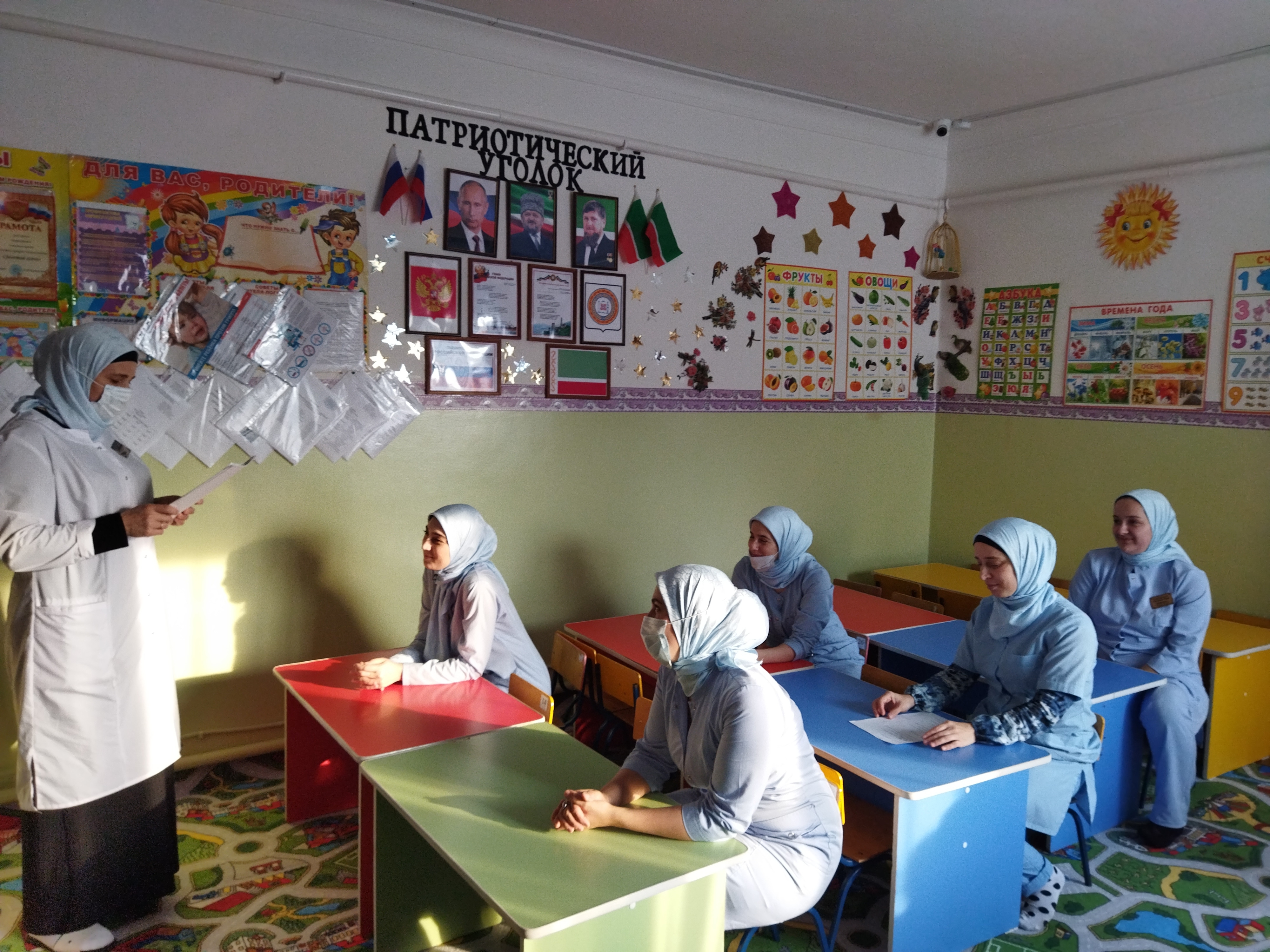 Сегодня медсестра нашего детского сада Гишлакаева Э. Ш. привела консультацию для педагогов на тему: "Меры обеспечения безопасности в ДОУ при коронавирусе (COVID-19) "