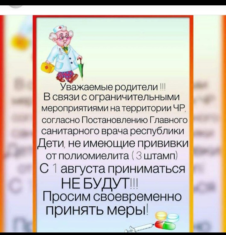 Уважаемые родители!!! С 1 августа Дети не имеющие прививки от полиомиелита (3 штамп) ПРИНИМАТЬСЯ НЕ БУДУТ!!! Просим своевременно принять меры.